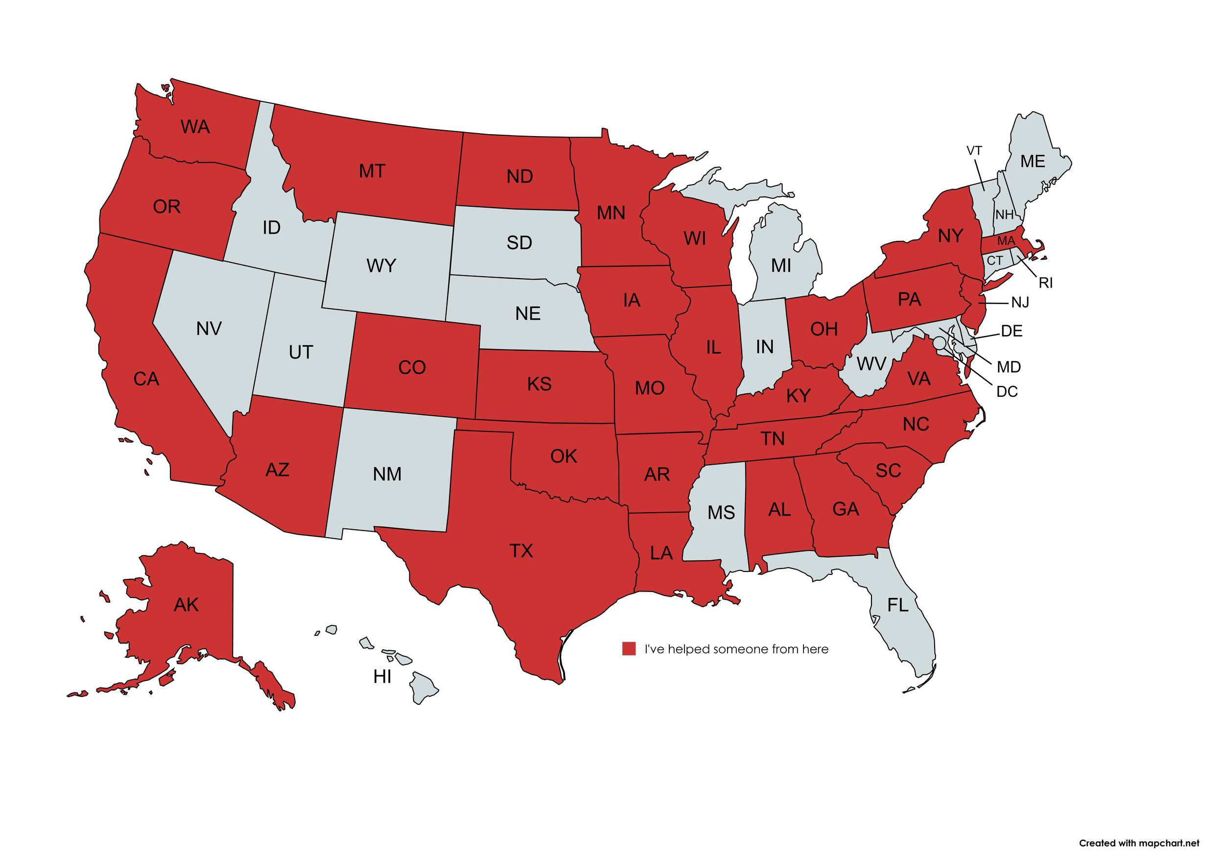 I have helped people from the states shaded in red.
